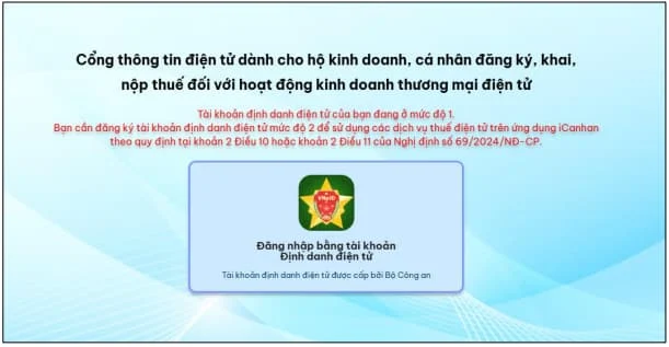 Người nộp thuế sử dụng tài khoản định danh mức 2 để đăng nhập sử dụng Cổng thông tin qua việc quét QR Code trực tiếp trên ứng dụng VneID (hệ thống đã kết nối trực tiếp với Cơ sở dữ liệu dân cư để xác thực thông tin định danh của người nộp thuế). + Nếu tài khoản định danh của bạn mức 1: Hệ thống hiển thị cảnh báo: