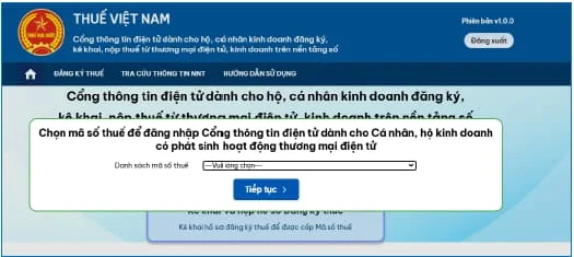 Theo thông báo mới nhất của Tổng cục Thuế về “Cổng thông tin điện tử dành cho hộ, cá nhân kinh doanh đăng ký, kê khai, nộp thuế từ thương mại điện tử, kinh doanh trên nền tảng số” thì từ ngày 16/12/2024, người nộp thuế sử dụng “Cổng thông tin điện tử dành cho hộ, cá nhân kinh doanh đăng ký, kê khai, nộp thuế từ thương mại điện tử, kinh doanh trên nền tảng số” phiên bản V1.0.0 thay cho các phiên bản trước đây.