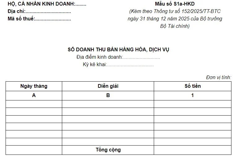 Trường hợp hộ kinh doanh, cá nhân kinh doanh thuộc đối tượng không chịu thuế giá trị gia tăng, không phải nộp thuế thu nhập cá nhân thì sử dụng Sổ doanh thu bán hàng hóa, dịch vụ (mẫu số S1a-HKD) sau đây, cụ thể: