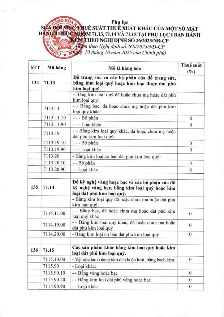 Ngày 10/10/2025, Chính phủ ban hành Nghị định 260/2025/NĐ-CP sửa đổi mức thuế suất thuế xuất khẩu đối với một số mặt hàng thuộc nhóm 71.13, 71.14 và 71.15 tại Biểu thuế xuất khẩu theo Danh mục mặt hàng chịu thuế ban hành kèm theo Nghị định 26/2023/NĐ-CP về Biểu thuế xuất khẩu, Biểu thuế nhập khẩu ưu đãi, Danh mục hàng hóa và mức thuế tuyệt đối, thuế hỗn hợp, thuế nhập khẩu ngoài hạn ngạch thuế quan.